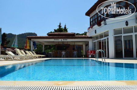Про пропитание. У меня был BB. О комплексном завтраке я уже писал в предыдущем отзыве, он совсем не изменился с весны. А ужинал романтично, на закате, сидя на балкончике номера прямо над бассейном, когда солнце скрывалось за гору Чалыш. Привез собой разных пакетированных супов и гарниров, чайник и сало. Гости отеля заказывали еду в близлежащих ресторанах. А я предпочитал периодически ходить в Мигрос за красным вином, сыром и дешевым пывом. Вино потом нашел поближе в одном из минимарткетов по дороге на пляж, качеством и ценой даже получше чем в Мигросе, там же брал вкуснейший турецкий хлеб и айран, очень желанный по утрам.