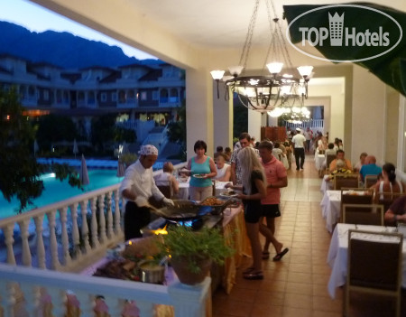 Обед и ужин были +- одинаковыми, но также выбор был огромный: 5-6 видом гарниров (картофель по-деревенски, пюре, макароны, запеканки, чечевица, рис), всегда несколько видов мяса (котлетки, говядина, телятина, курица), несколько видов рыбы (жареная и на пару). Иногда бывала наже красная рыбка, очень вкусно. Много овощей, салатов (и с заправками, и без). Очень много десертов, действительно вкусных, а не как во многих турецких отелях, 2-3 вида пахлавы. Блюда всегда доносили, если заканчивались. Единственное, что не доносили – красную рыбу и некоторые из фруктов (персики и грейпфруты, их разбирали в первые 15 минут). Еще из фруктов были яблоки, груши, апельсины. Совсем не было дынь, арбуз был только 1 раз в Турецкую ночь.