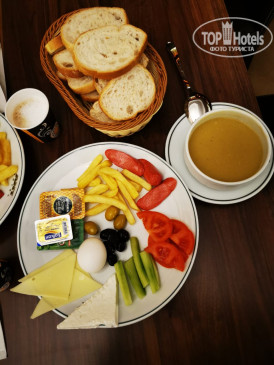 Столовая находится на -1 этаже. Очень приятно оформленное помещение. Завтраки достаточно однообразные. Всегда присутствовали: жареные сосиски, пирожки с сыром, свежие овощи, омлет, картошка фри, вареные яйца, йогурт(развесной), хлеб, мед, джем, шоколадная паста, чай, кофе, мандарины. Каши на завтрак не было! За это по питанию "5-". Вместо каши был суп. Раз в несколько дней он менялся: кисломолочный с травами, томатный с макаронами и т.д. примерно 4 разных варианта. Я ел суп каждый раз, вкусно.