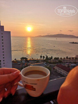 Наш отель расположен недалеко от моря и большой дороги, но в переулке, поэтому шума не было слышно. Зато был хорошо слышен перезвон колоколов католического собора, особенно по утрам) Нам достался номер 1009 с видом на город на десятом этаже. Номер для двоих достаточно просторный, с балконом узеньким, но постоять и полюбоваться видом. Есть чайник, ежедневно пополняют запасы чая и кофе (сахара нет!), дают по бутылке воды 0.33 на человека, стоит вода 1,5 литра платно, 20 донгов. Чтобы поменяли постельное белье, пришлось просить на ресепшн, хотя должны его менять раз в три дня. Полотенца меняют ежедневно.