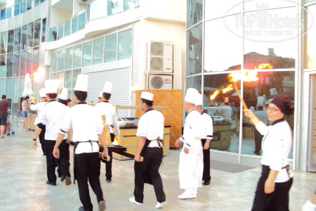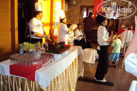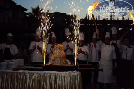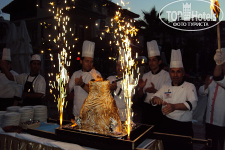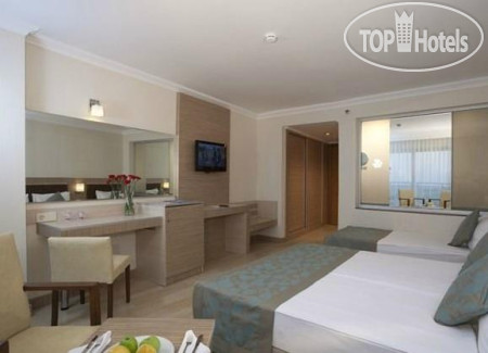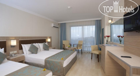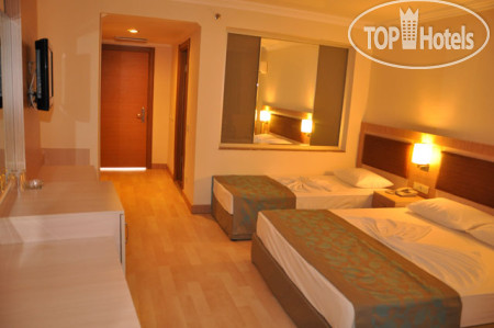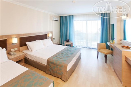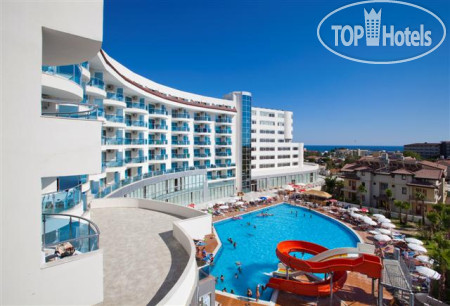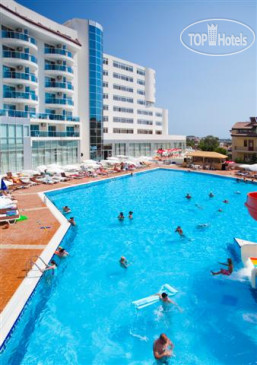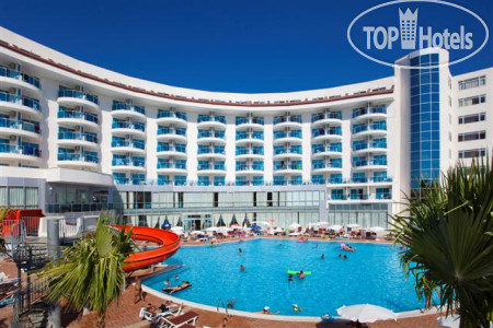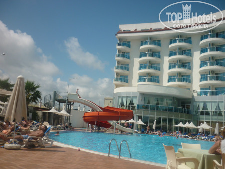 Прекрасный отель! Ездили семьёй (с ребёнком 3 года) К выбору отеля подошла основательно. В первую очередь интересовали развлечения для ребёнка, а их там предостаточно! Каждый вечер бесплатные аттракционы, анимация, детский городок! Мороженое безлимит, целый день! Приехали в отель в 10 утра, надели браслеты и пошли кушать! В 11 нас уже засели в прекрасный номер с видом на море (без всяких доплат) Жили в основном корпусе, на 5 этаже. В этом корпусе находится и ресепшн, лобби, основной ресторан, хамам. Номер стандартный, мебель не новая, но в хорошем состоянии, вся техника работала. В целом всё как в отелях данной ценовой категории! Питание отличное, каждый вечер разнообразие мяса на гриле, форель. Для ребёнка всегда можно было найти подходящее меню ( тушеное и отварное мясо, рыба, спагетти, каши, ну и конечно фастфуд))) Выпечка прекрасная. Овощи, фрукты, сладости - всего было в изобилии! Спиртные напитки : вино хорошее, пиво неплохое, коктейли как повезёт ( больше ничего не пробовали) В бассейнах не купались, так как решили не рисковать (не хотелось подцепить ротовирус) Много проводили времени на море! Автобус ходил по расписанию, но пешком 5-7 минут! Минус :нужно переходить дорогу, большой поток машин, перехода нет. Ну, и необлагороженность дороги , со всех сторон мусор.