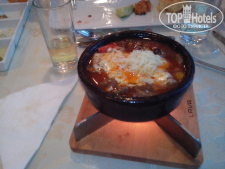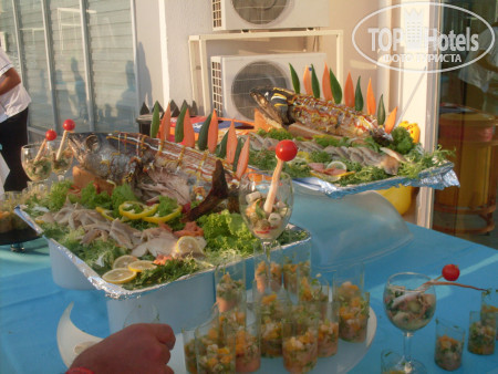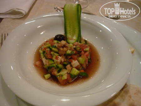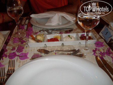 Посетили мы ресторан  а-ля карт, рыбный. Скажу сразу, что идти туда нужно голодными, иначе вы не осилите все меню) Салат из зелени с вкусным соусом, закуска из слабосолёной и копченой рыбки, суп с морепродуктами, жюльен с креветками и горячее- я заказывала семгу, запеченную в виноградных листьях со шпинатом, муж брал форель с грибами и овощами. На десерт маффины с жидким шоколадом и шариком ванильного мороженого . Очень все вкусно, Подача блюд отличная, официанты предупредительны, и вежливые.