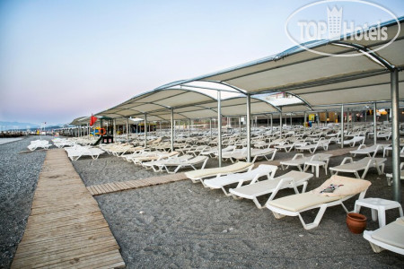 Море, оно восхитительно! В середине сентября море теплое, прозрачное, шторм был 1-2 раза всего, погода была устойчивая. Протяженность пляжа и водной зоны небольшая, если любите плавать свободно, то нужно проплыть чуть дальше к буйкам. Глубина чувствуется достаточно близко к берегу, пляж галечный (мелкая), но желательно все-таки купить обувь, потому что выходить из моря очень неудобно и больновато, но рядом есть спуск в воду оборудованный. Лежаков на всех хватало, если идти по главной дорожке, то справа были места для курящих, слева для тех, кто не курит. Персонал на пляже работал отлично, всегда все убирали, двигали лежаки, чтобы был порядок и следили за спокойствием и безопасностью. На пляже есть песочница для деток крытая, там есть много формочек, ведерок, что очень удобно, хотелось бы, чтобы приспособили там бортики для сидения родителей, пока детки играют. Также рядом есть воллейбольная площадка и крытая терраса для занятий спортом (танцы, гимнастика). Особое наслаждение заниматься в 16:00, когда уже не так жарко, рядом позитивные люди и краем глаза видно море и ощущаешь бриз.